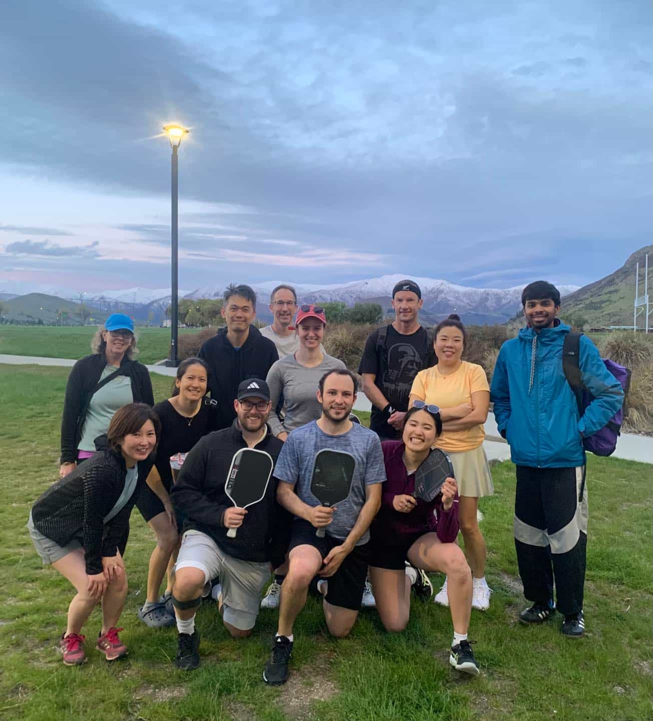 After the indoor games, we stepped outside… and wow! The snowy Crown Range was right there as our backdrop. Almost made us forget how tired we were from all those smashes and dinks.